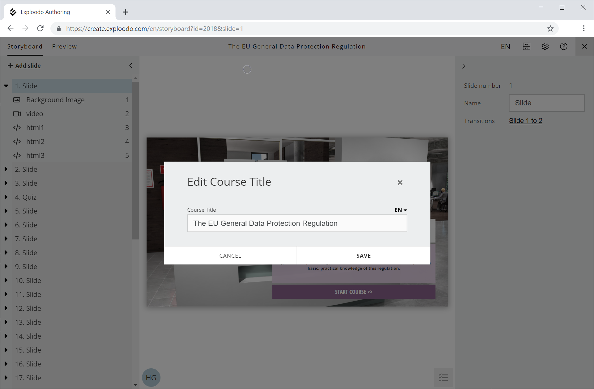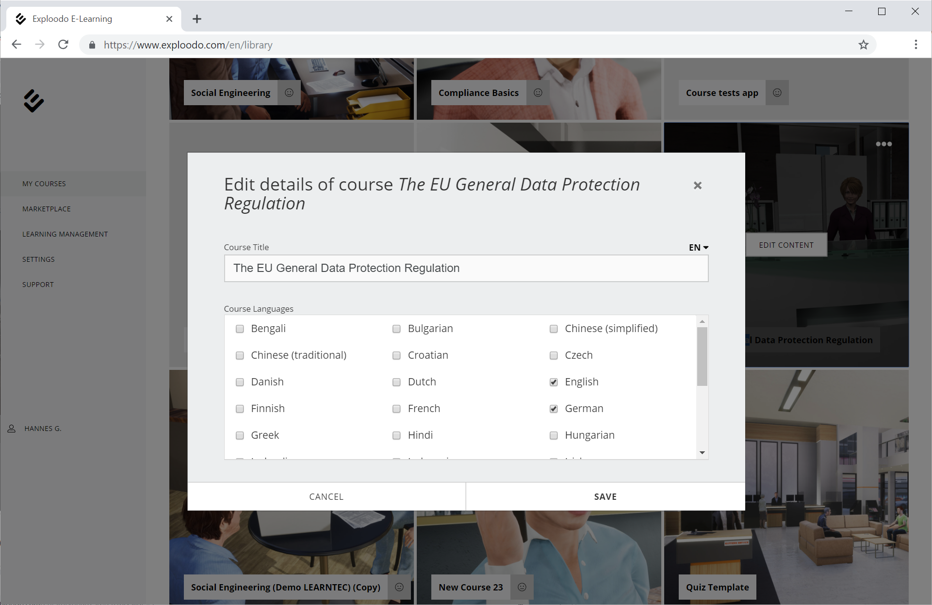 The standard language for new courses is English. However, you can add other languages too. To do so, go to the Exploodo course library, hover over a course with your cursor and click on the three dots to open the course menu. Select "Edit course details" in the menu to set the languages for your course.