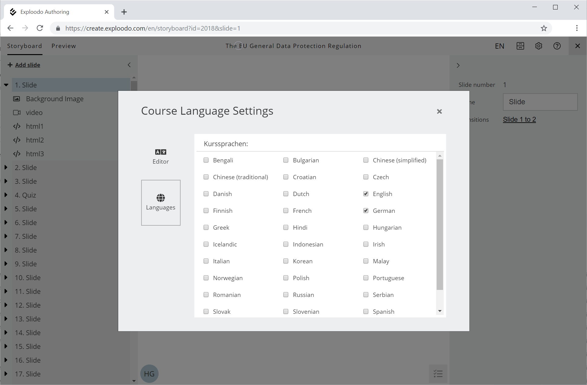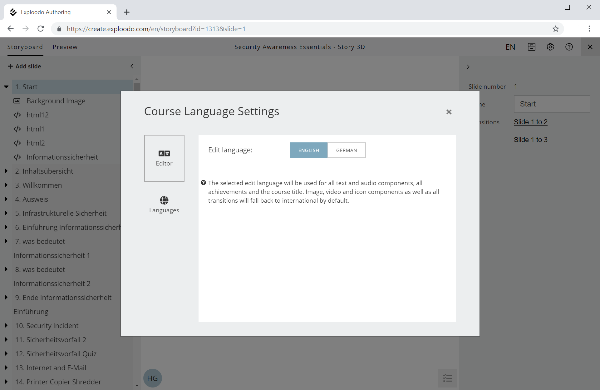 The selected language will be used for all text and audio components, achievements and the displayed course title. Image, video and icon components will be set.