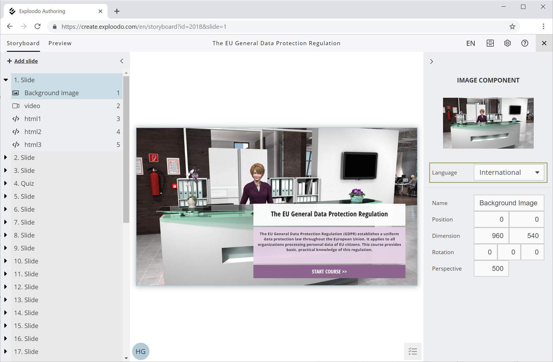 Course authors can also set a language for content items. In addition to the course languages, each component (content item) on a slide also offers the language option "International". This setting is used as a fallback in case you did not (wish to) define a translation for the component in the active language. "International" is also the standard setting for image, video and icon components.