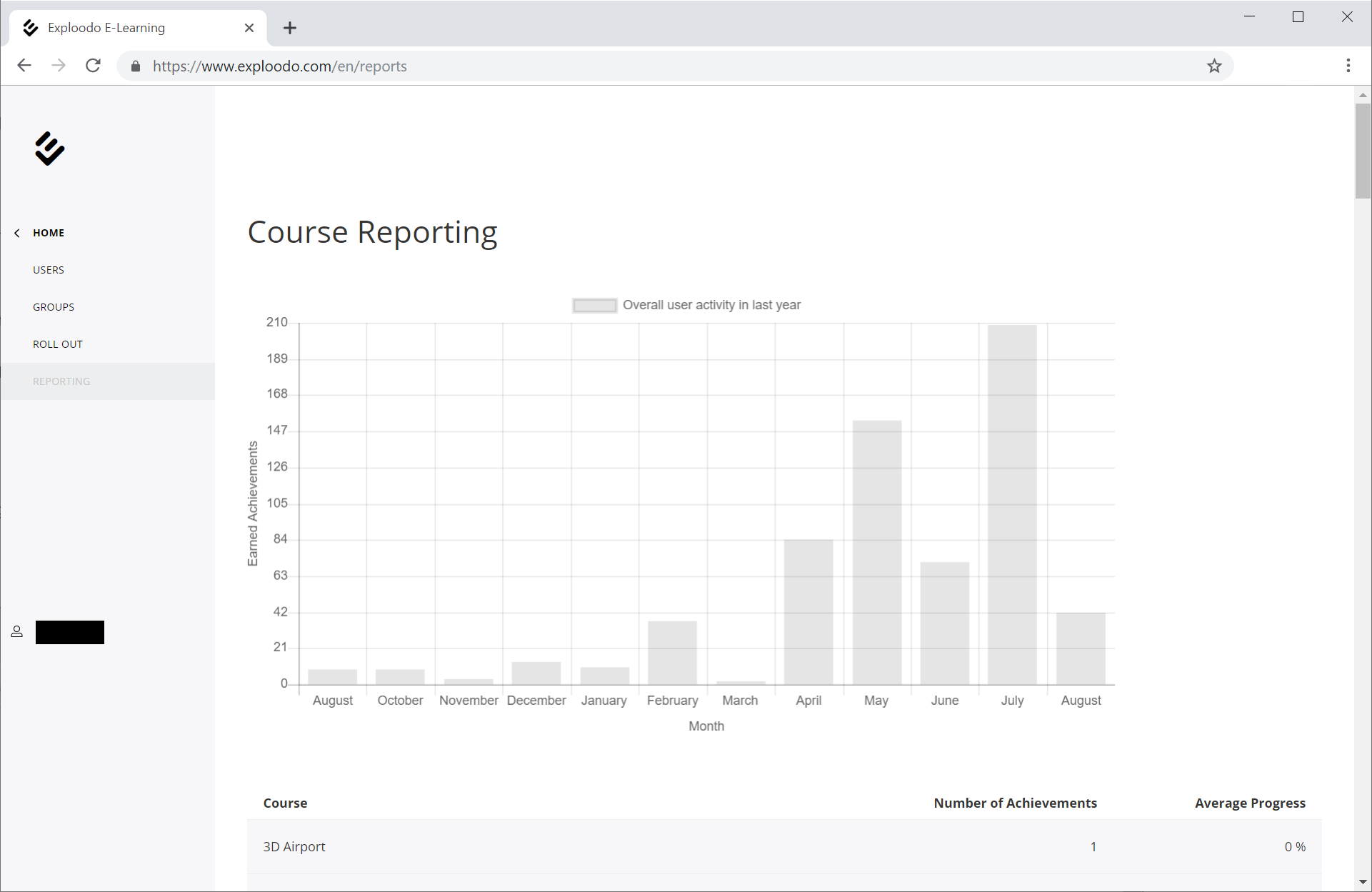 In the Reporting overview, you can see the user activity in the past year and the number of achievements all users have gained in all courses. For each course, the average achievement progress of the users and the number of course achievements are displayed.