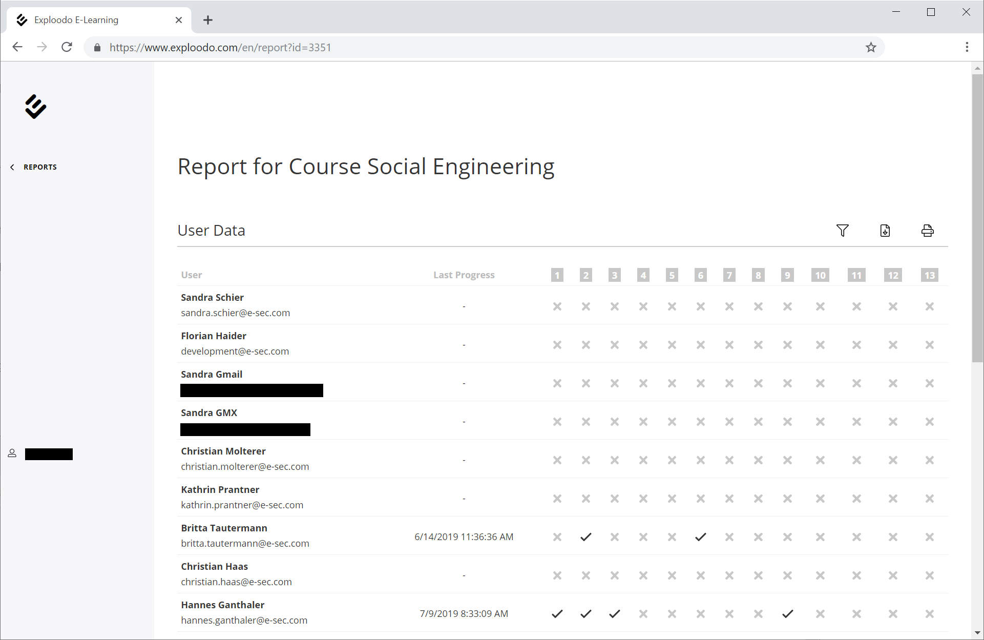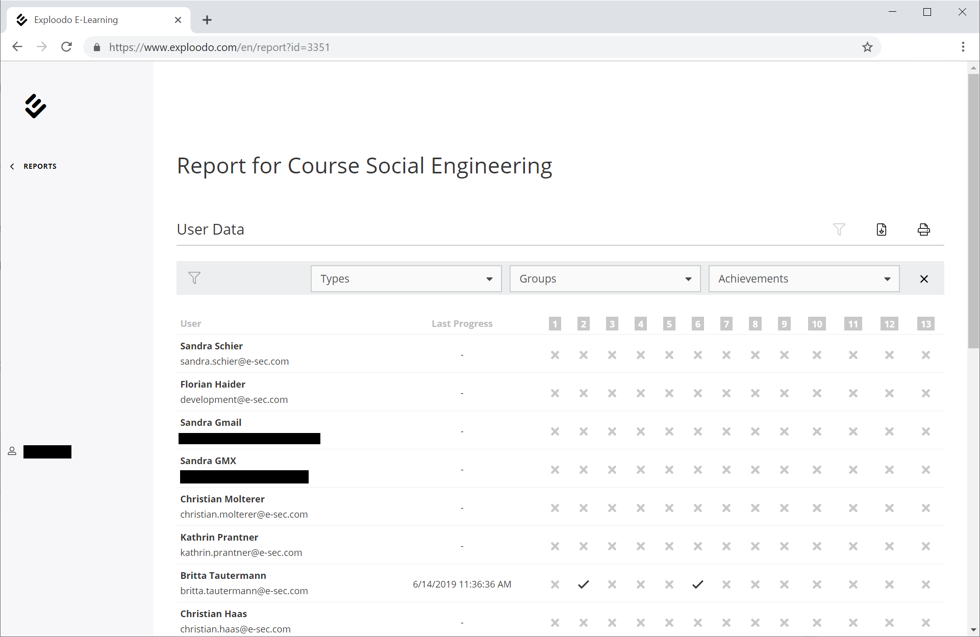 By selecting a course in the course list, you can open the detailed reporting view of a course. There you can see the users with their course achievements and status (achievement gained / not gained). In addition, you can see when a user gained his last achievement (last progress).