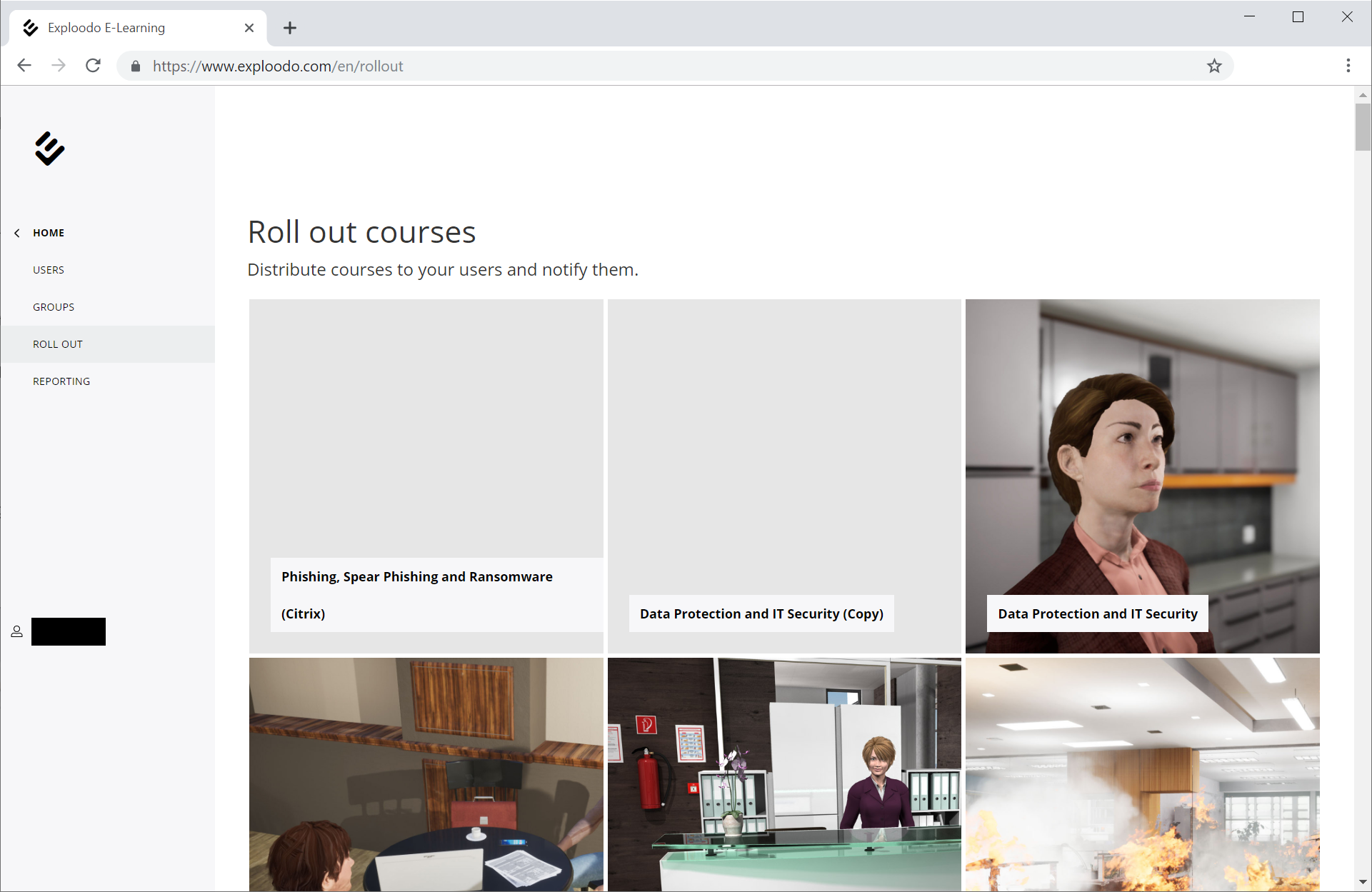 Via the menu item "Learning Management" on the left-hand side of your browser window, you can reach the "Roll Out" menu. There you can assign courses to users who you would like to invite to your training (Roll-Out). This menu is only available if you have the right subscription (LMS manager).