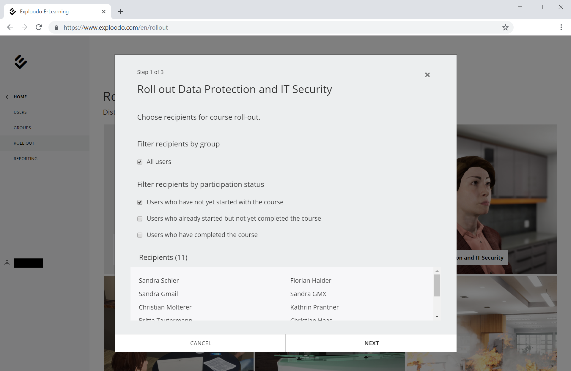 For the Named User Roll-Out, select the users who you want to take your training. You can choose between all the previously assigned users or certain groups. Users can also be filtered by their participation status. To double-check the selected users, you can take a look at the list of all the users who will be invited to the course under the heading "Recipients".
