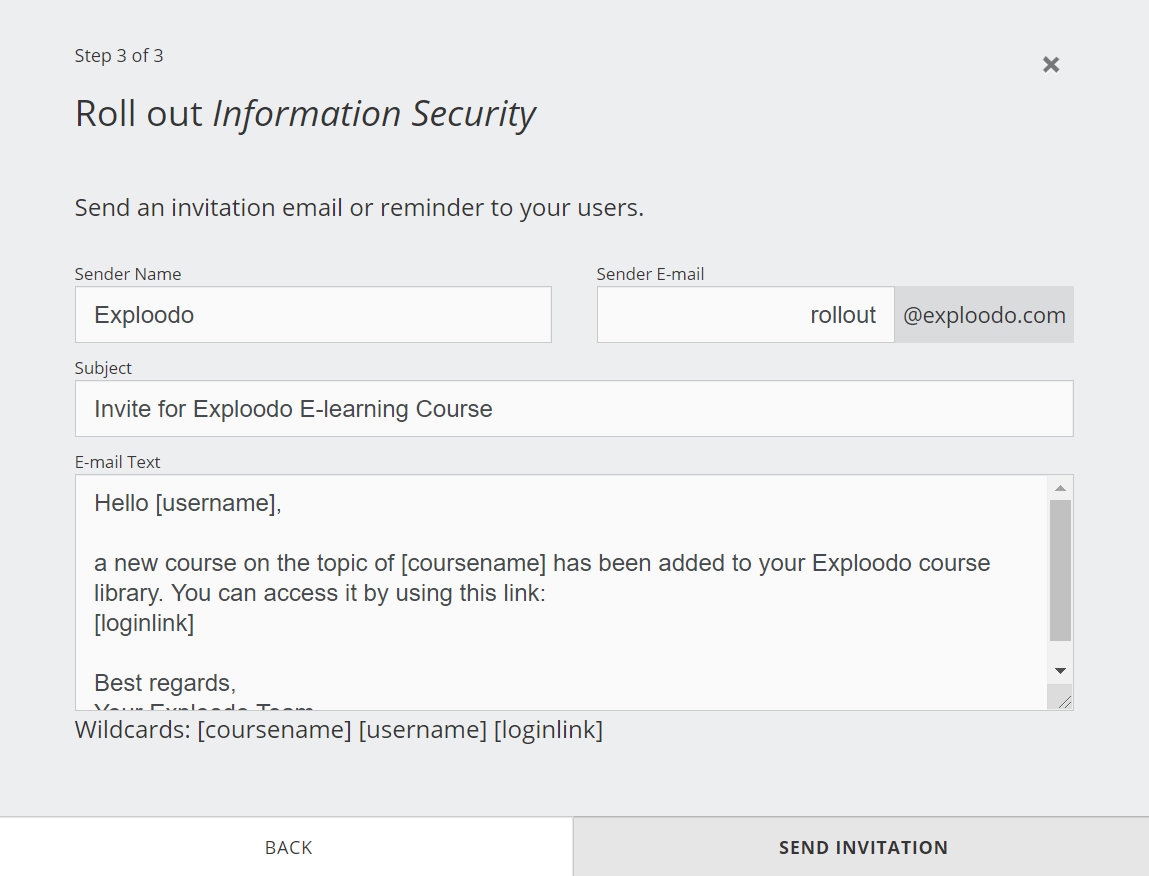 Here you can do some basic adjustments like choosing a custom sender and subject as well as adapting the E-mail text to your own needs. The invitation E-mail contains the course title, a personal login link and the user name. It will be sent to all the previously selected users. For more information about customizing the E-mail sender, please refer to this article.