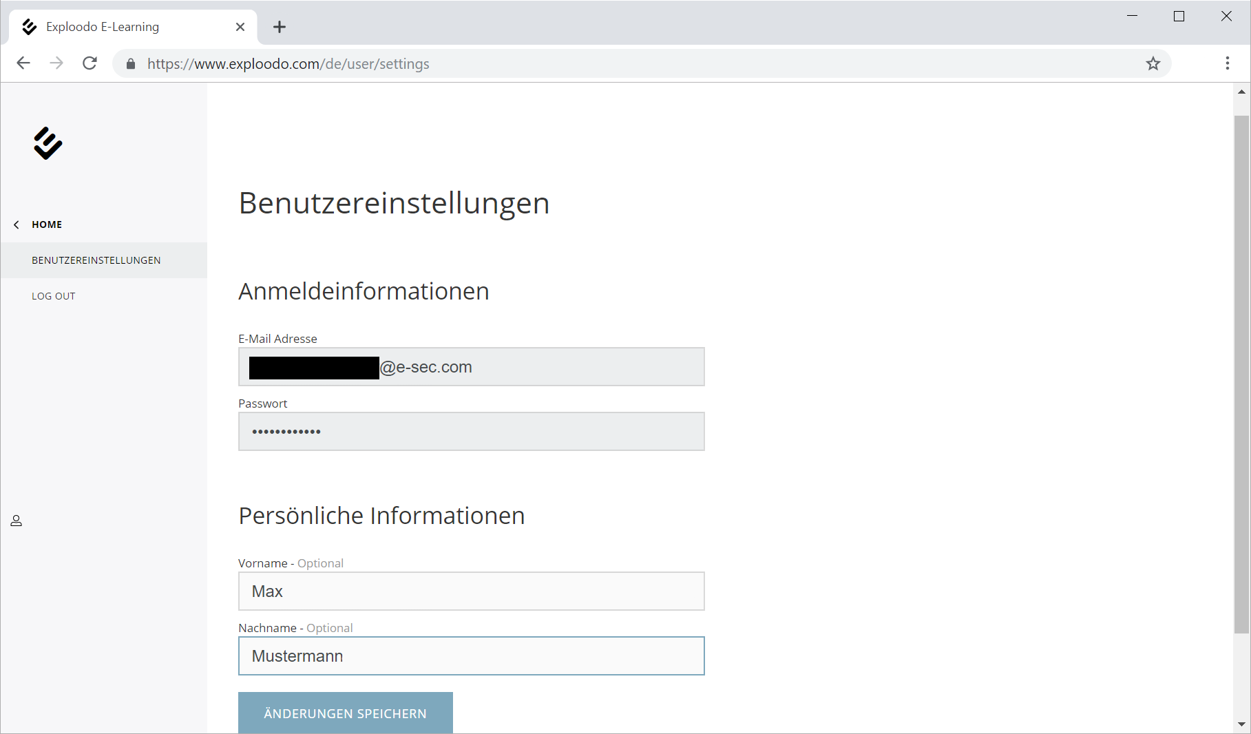 Jeder Account hat mindestens einen Admin-Benutzer welcher sich persönlich bei Exploodo anmeldet. Die zugehörigen Daten zum Benutzer, die er auch für das Login verwendet, können eingesehen und geändert werden. Klicken Sie auf Ihren Namen (Vorname und Anfangsbuchstabe Ihres Nachnamens) unterhalb des Menüs am linken Rand der Website, um zu den Benutzereinstellungen zu gelangen. Dort können Sie sich auch ausloggen.