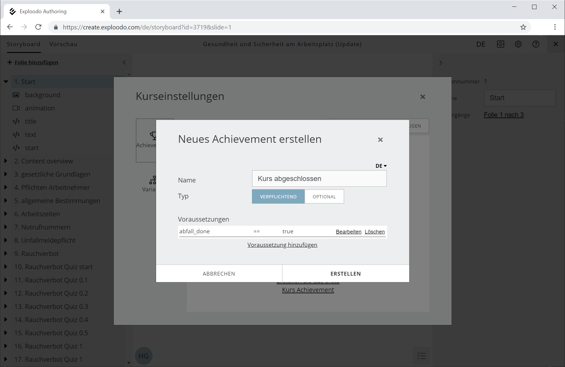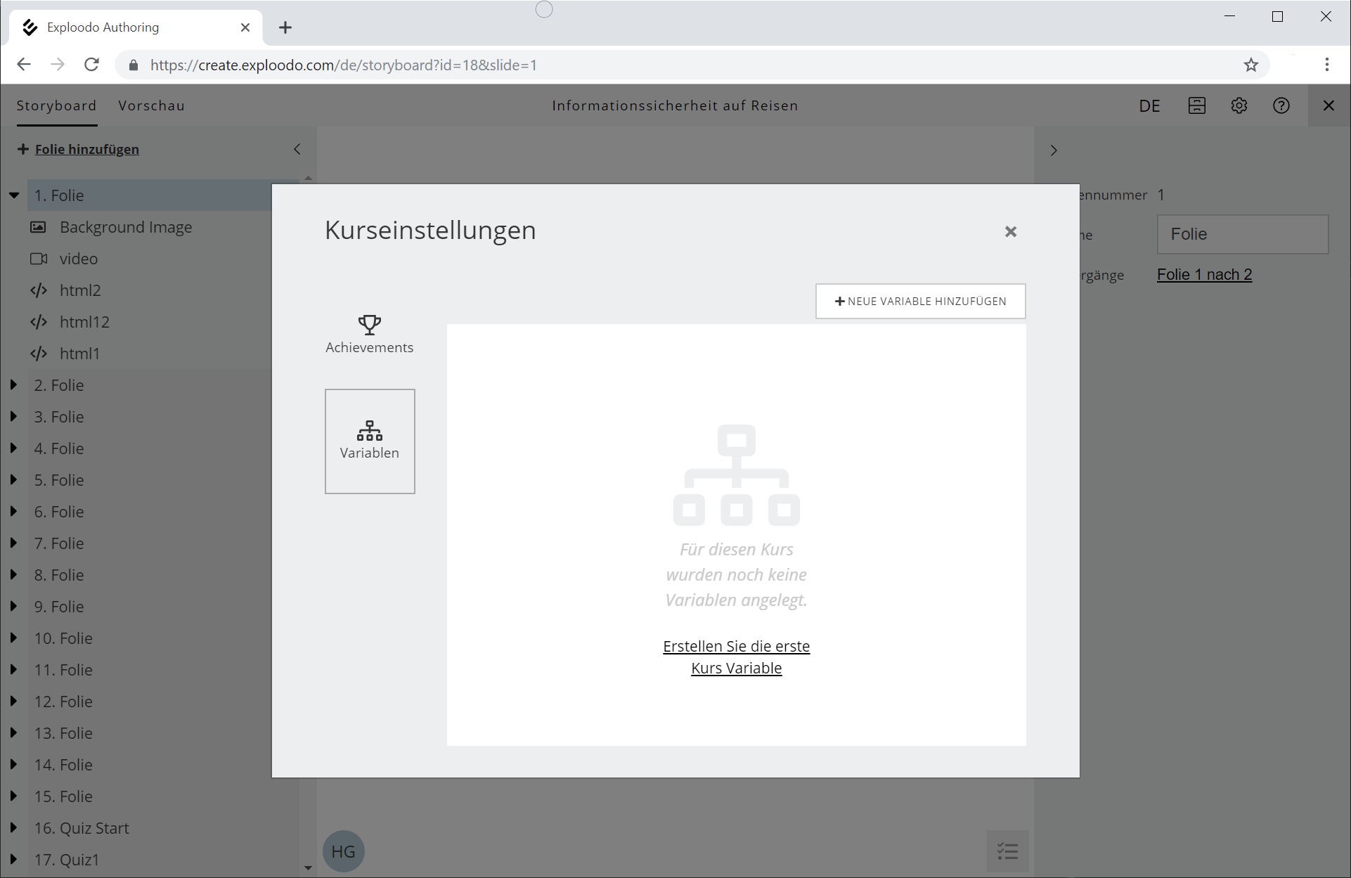 - Sobald der Benutzer die letzte Folie öffnet wird die Variable "Kurs abgeschlossen" auf "true" gesetzt und er erhält den Erfolg "Kurs abgeschlossen".