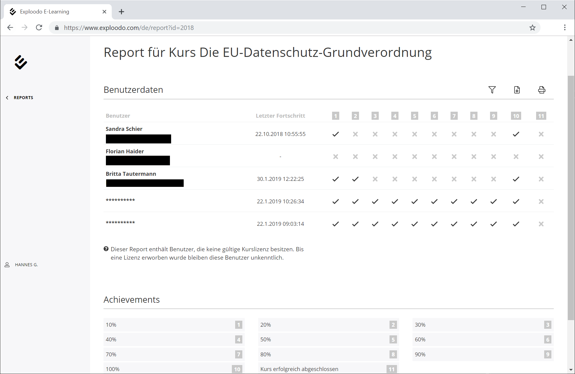 Sie können die Erfolge von Kursen und dazugehörige Benutzer in der Kurs-Auswertung (Reporting) einsehen. Nur wenn alle Voraussetzungen zutreffen wird der Erfolg dem Benutzer zugeordnet und als erreicht angezeigt. Beispiel eines Erfolges ist "Kapitel 1", "Kurs abgeschlossen", "Frage X beantwortet", "Alle Fragen beantwortet", "Folie X gesehen", "Komponente X ausgelöst" usw.