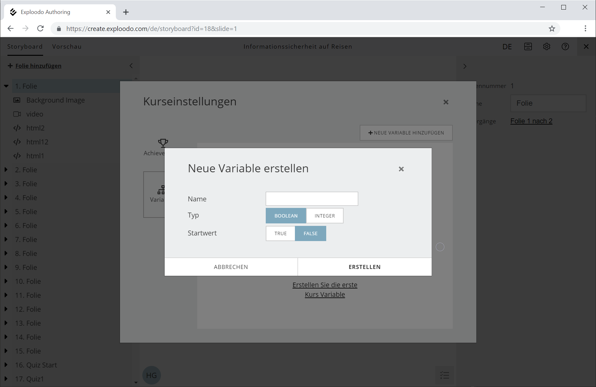 - Erstellen Sie eine Variable mit Namen "Kurs abgeschlossen", Typ "Boolean" und Startwert "false".