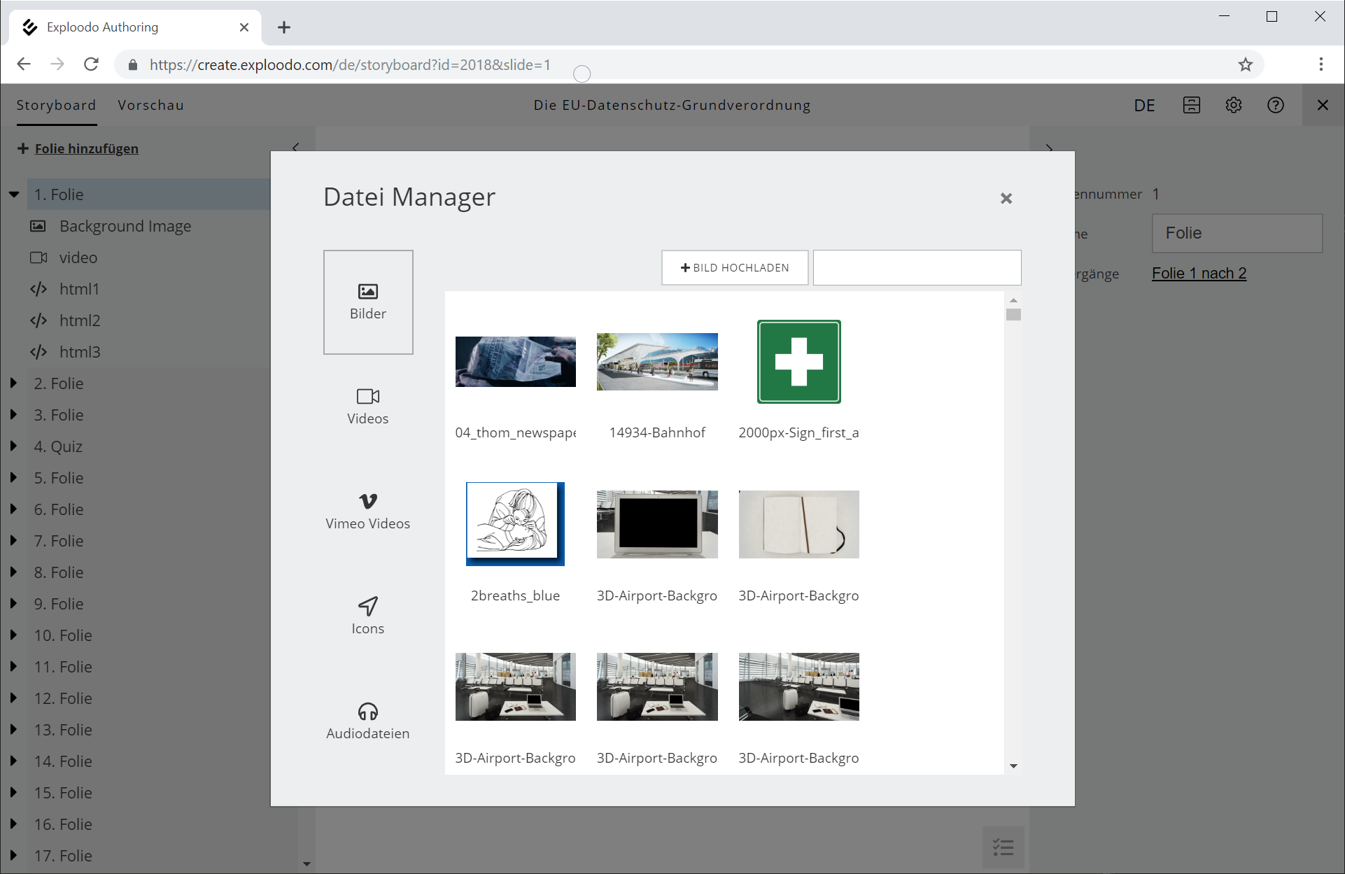 Hier können Dateien wie Bilder, Videos, Audios hochgeladen oder Vimeo Videos eingebunden werden. Symbole (Icons) können aus einer vordefinierten Liste ausgewählt werden.
