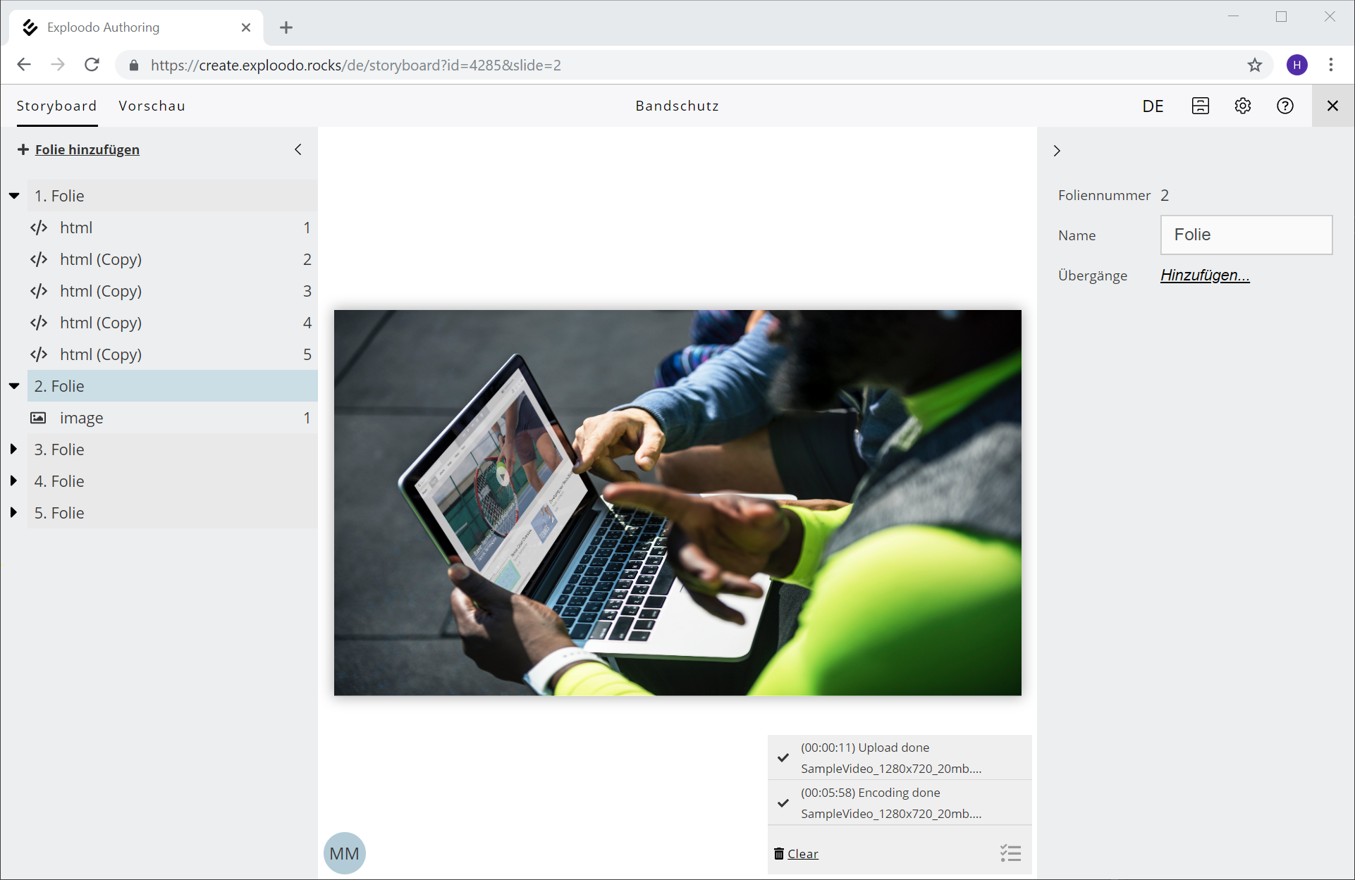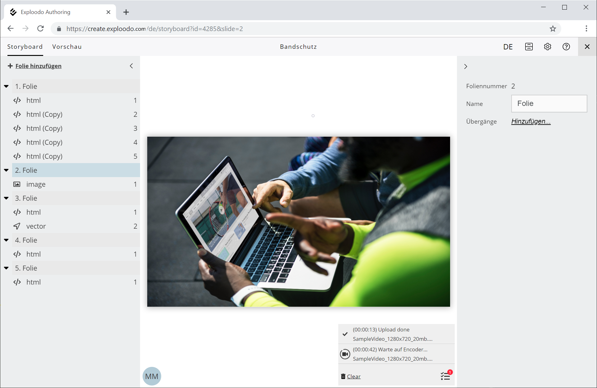 Wenn ein Datei hochgeladen wird, startet rechts unten im Aufgaben-Menü eine neue Aufgabe (Task). Hier wird der Verlauf des Uploads und eventuelle weitere Prozesse, die nötig sind damit Sie die Datei im Kurs verwenden können, angezeigt. Diese Verarbeitung kann je nach Dateigröße und Dateiart einige Minuten dauern. Sie können mehrere Uploads (Tasks) zugleich starten. Die Anzahl der laufenden Task wird mit einer roten Ziffer im Task-Menü angezeigt. Es werden auch Tasks anderer Autoren, die den Kurs bearbeiten, angezeigt.