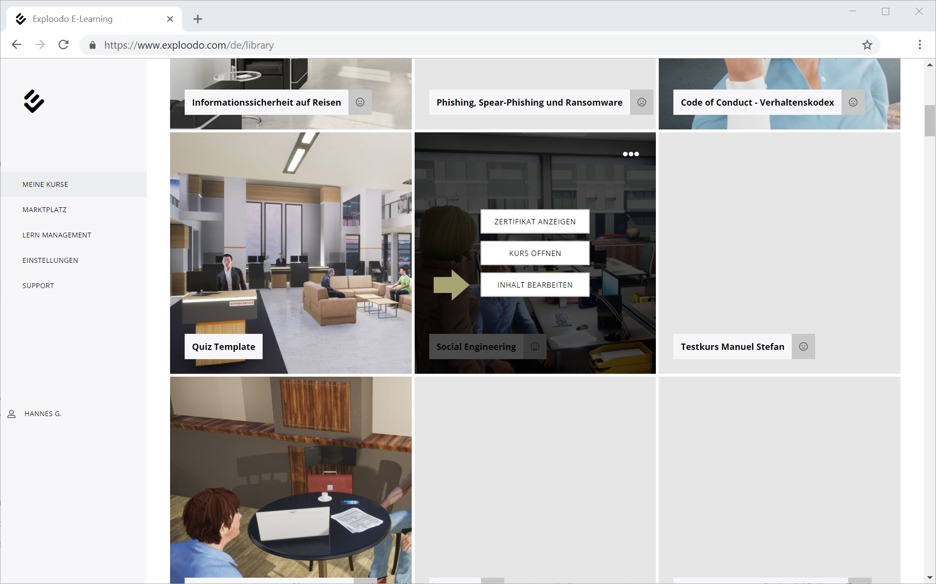 Mit dem Bearbeiten eines Kurses beginnen Sie in Ihrer Exploodo Kurs Bibliothek. Klicken Sie beim Kurs auf "Inhalt bearbeiten" um so Veränderungen durchführen zu können.