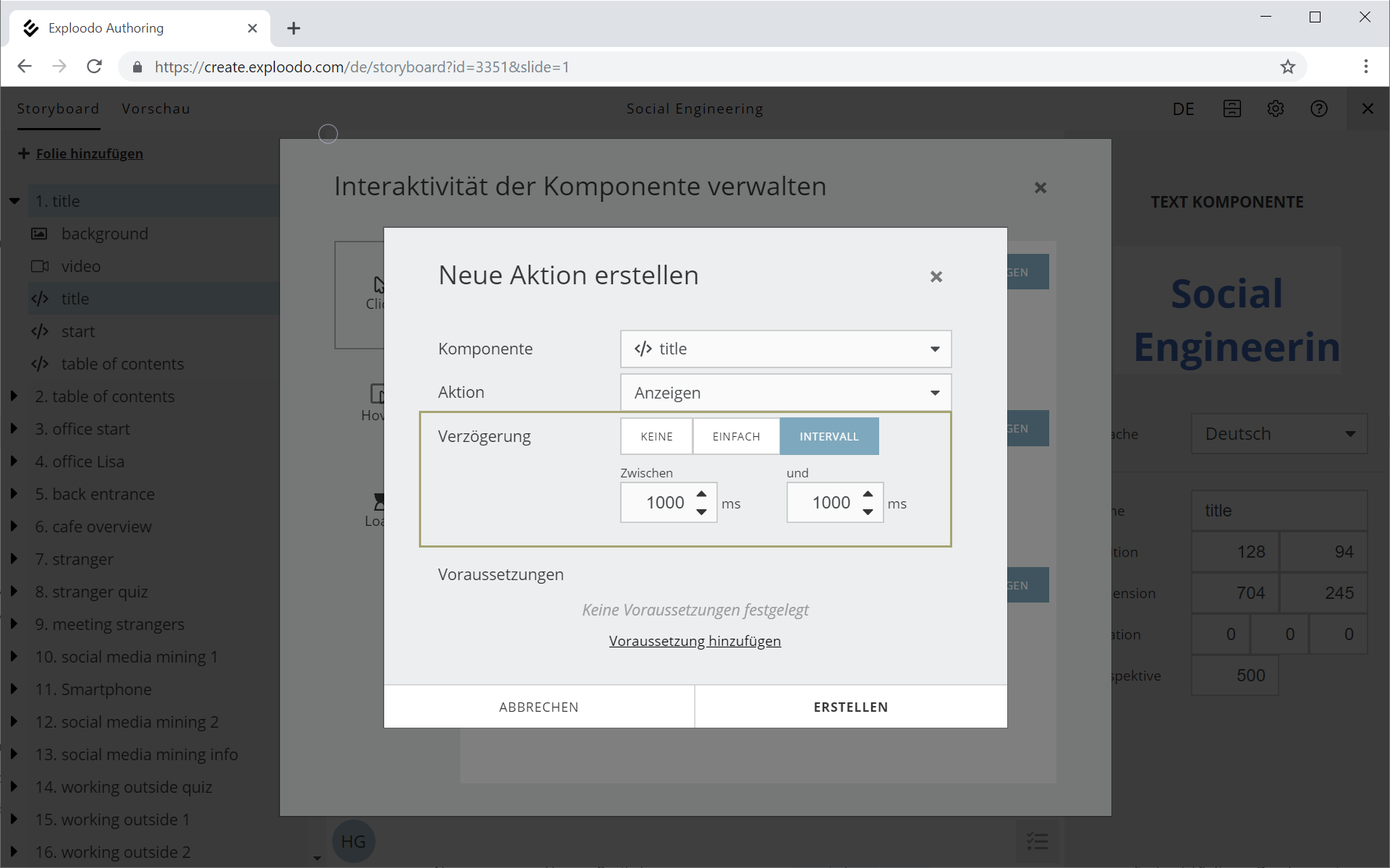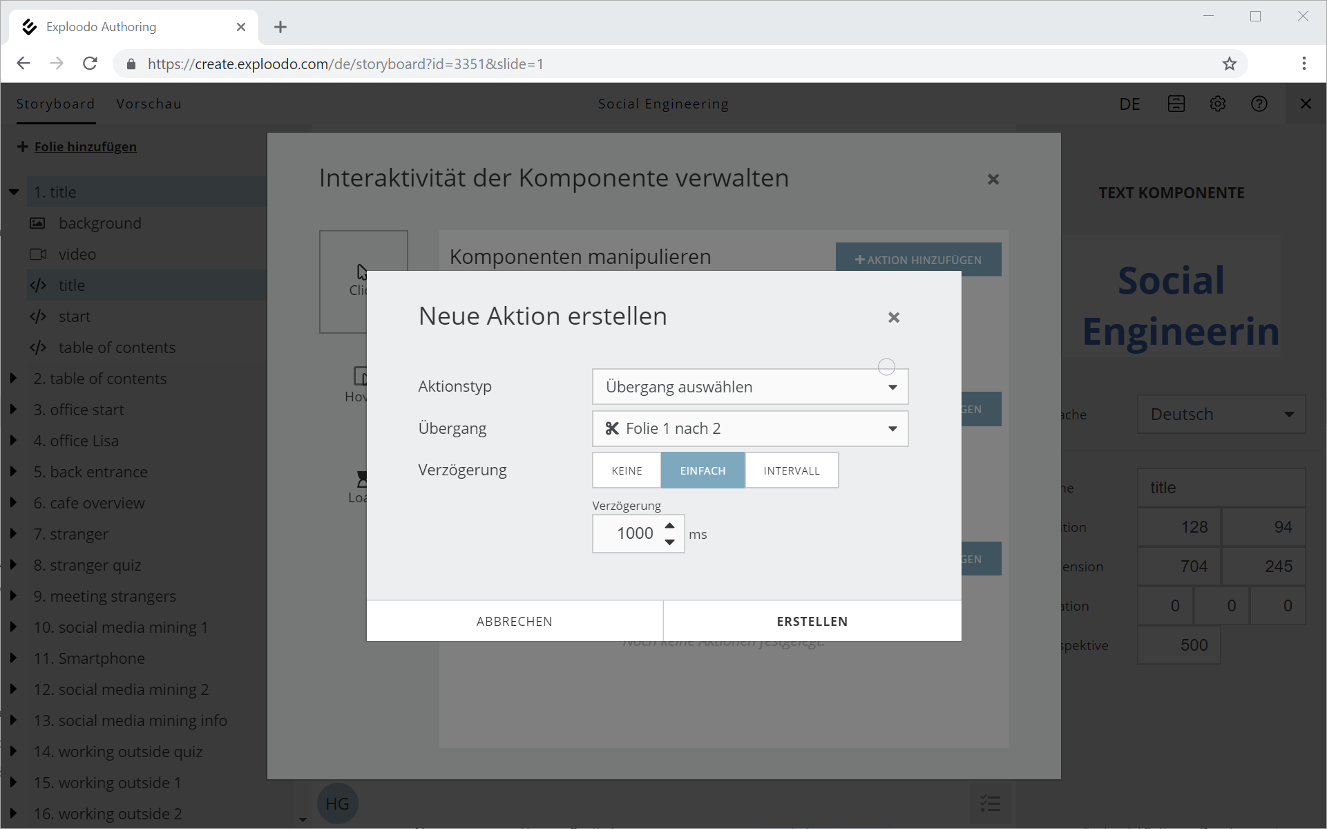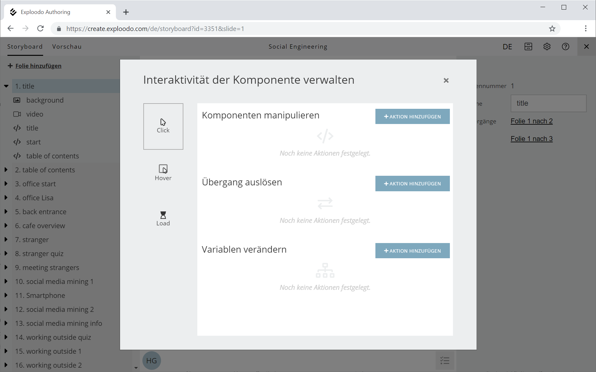 Sie können im Menü "Interaktivität der Komponente verwalten" Aktionen zum Komponenten manipulieren der jeweiligen Folie anlegen. Dabei können Sie je nach Komponente verschiedene Aktionen definieren. z.B.: Komponente anzeigen, ausblenden oder Video, Vimeo Video oder Audio Komponente starten, stoppen und vor- und zurückspulen.