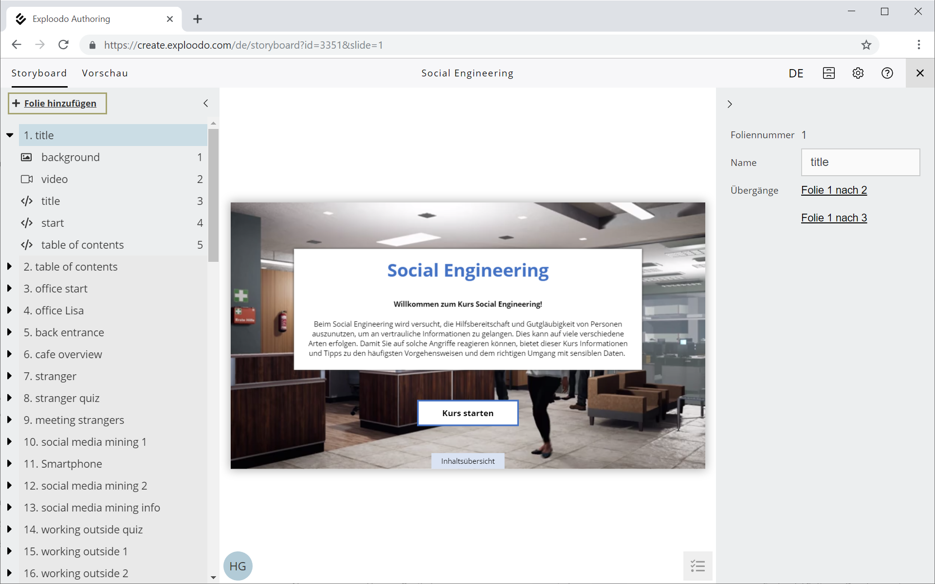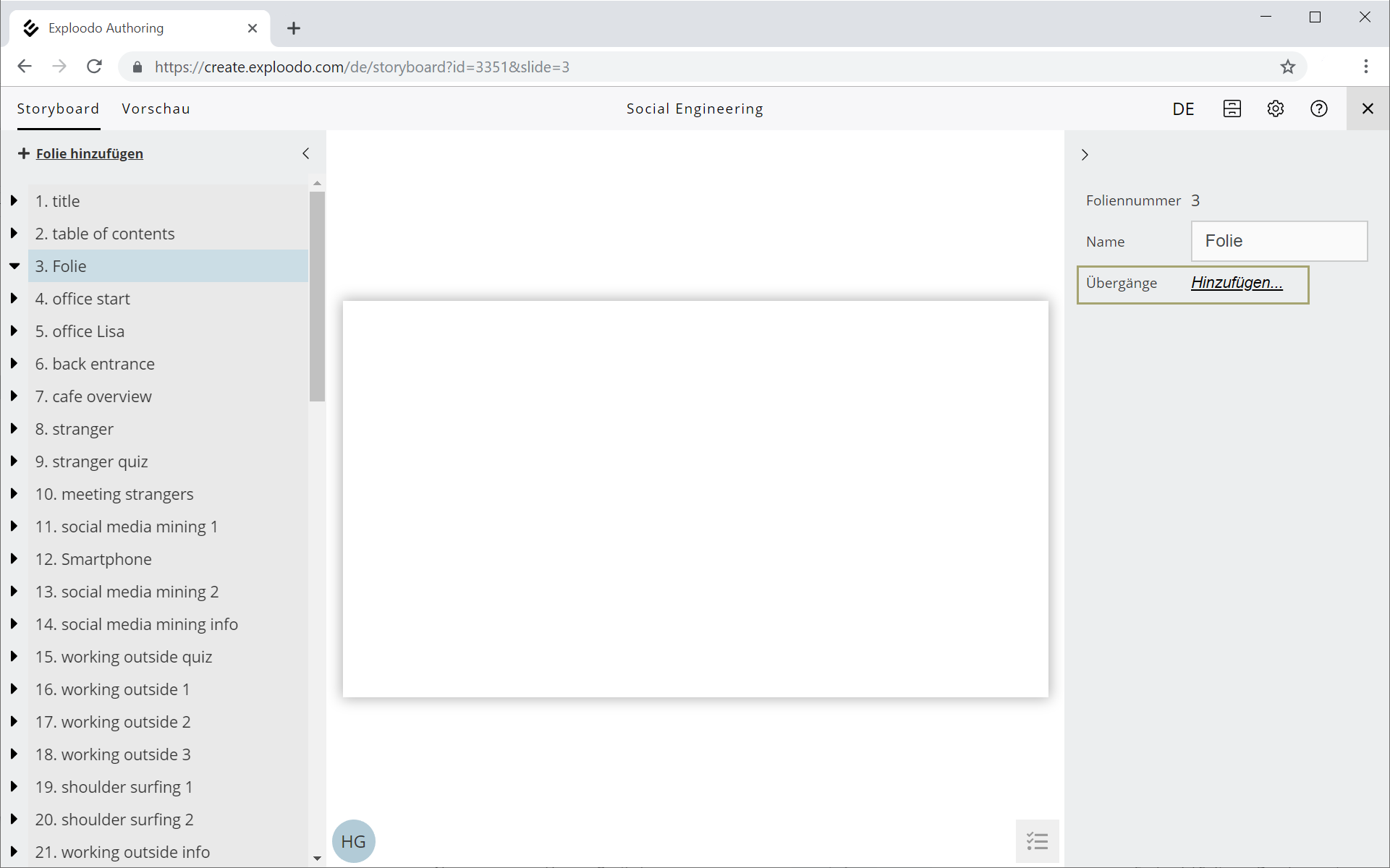 Klicken Sie auf "+ Folie hinzufügen" im linken Seitenmenü um nach der ausgewählten Folie eine neue Folie hinzuzufügen. Durch Auswählen der Folie im linken Seitenmenü erscheinen in der rechten Spalte Ihres Browserfensters diverse zusätzliche Bearbeitungsmöglichkeiten, wie Folien-Name und Übergänge.