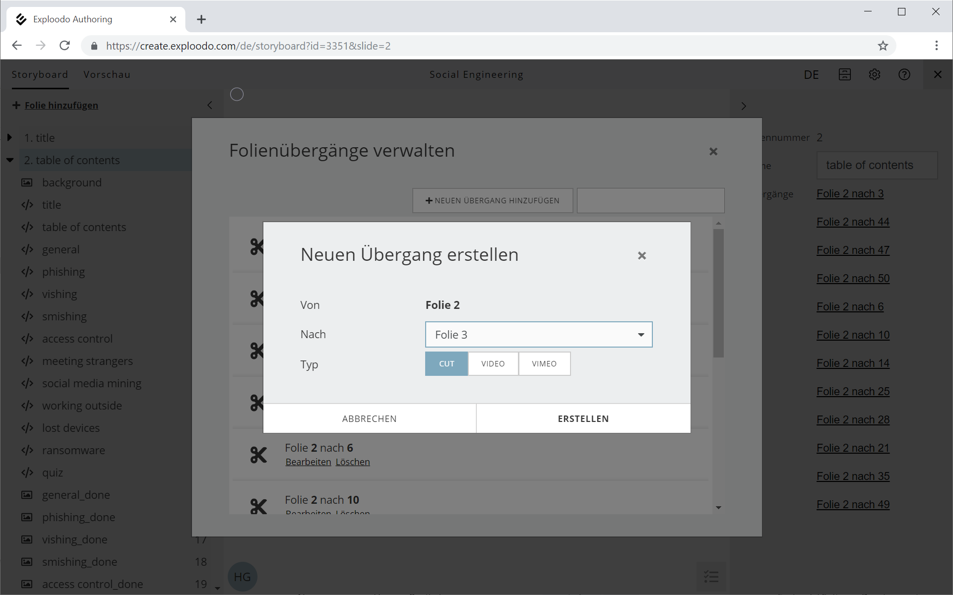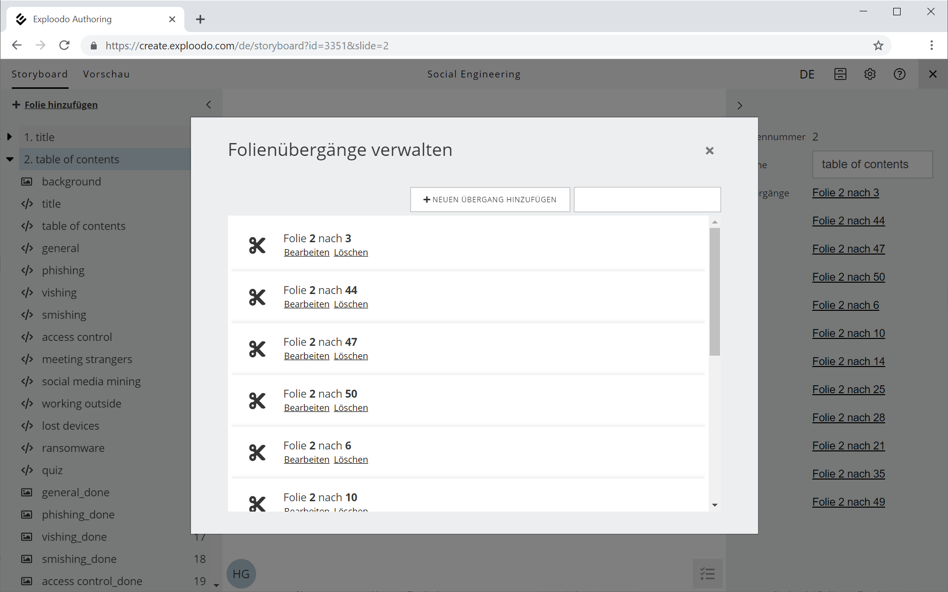 Mit Klick auf "Neuen Übergang hinzufügen" können Sie einen neuen Folienübergang von der ausgewählten Folie zu einer anderen definieren.