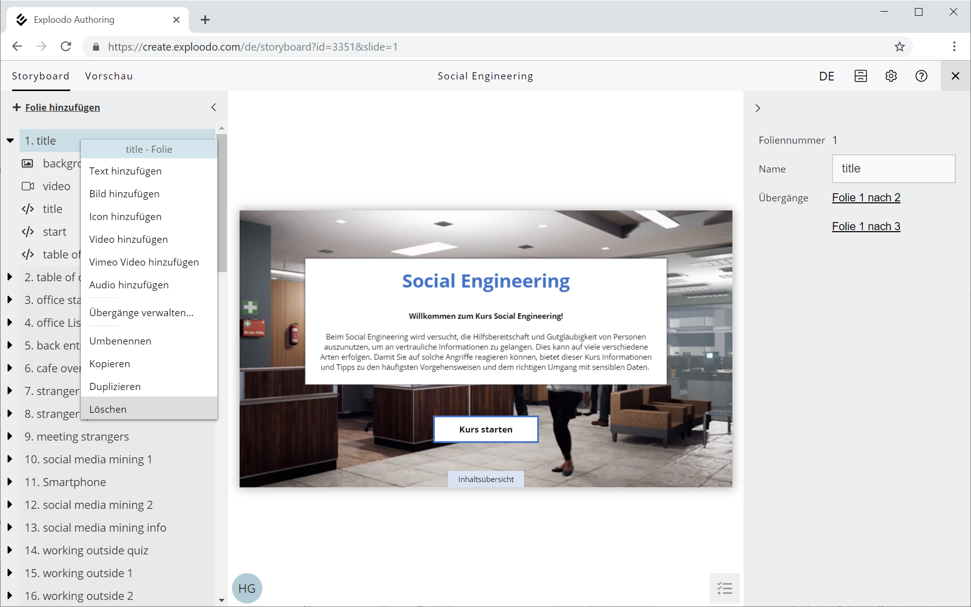 Um Folien zu löschen, wählen Sie die Folie im linken Seitenmenü aus und öffnen mit Rechtsklick das Folien-Menü.