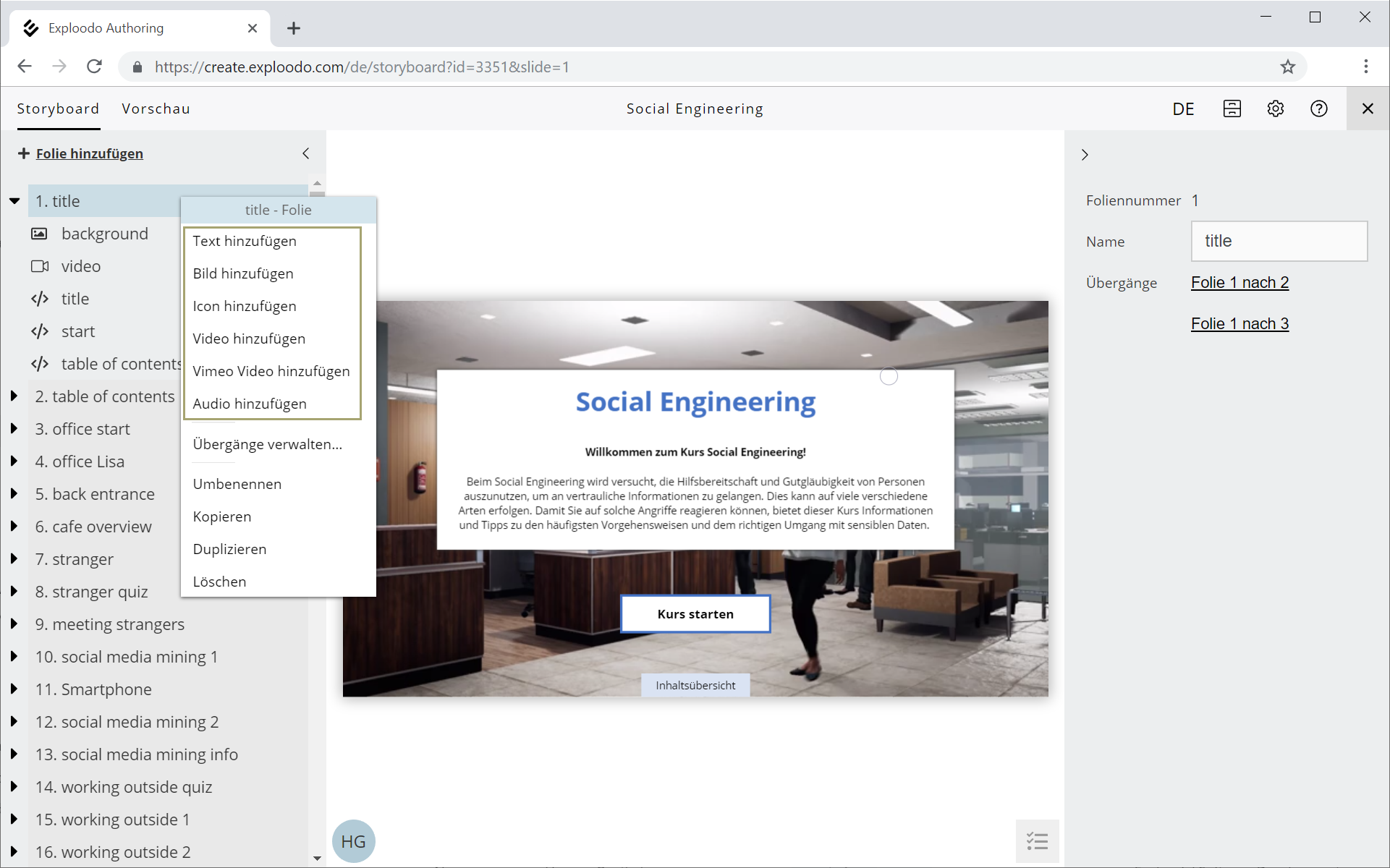 Um einen neuen Inhalt zu erstellen, wählen Sie im linken Seitenmenü eine Folie aus, öffnen mit Rechtsklick das Folien-Menü und klicken auf den gewünschten Inhalts-Typ.
