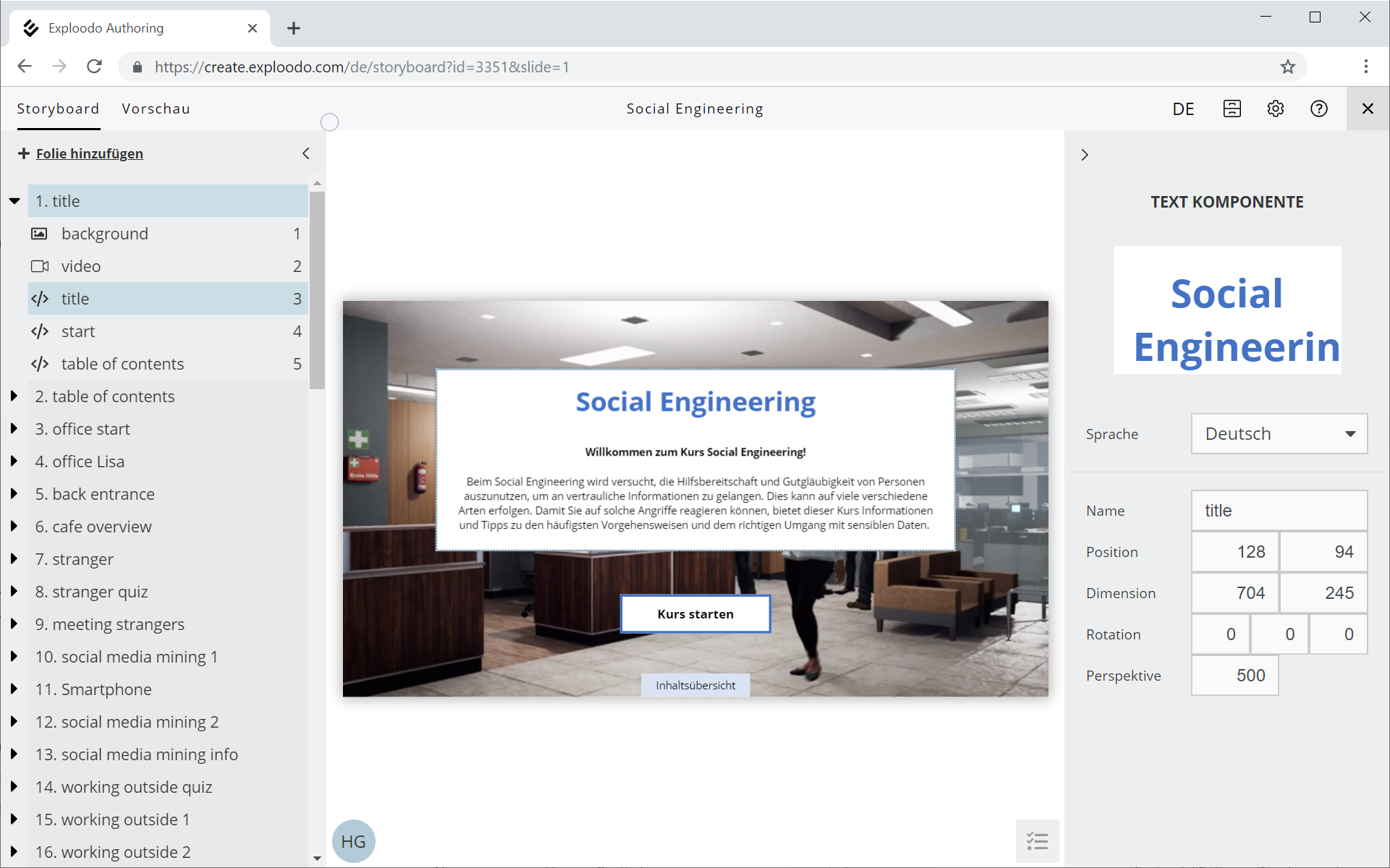 Machen Sie einen Doppelklick auf den Inhalt, um ihn zu bearbeiten. Je nach Inhalts-Typ erscheinen in der rechten Spalte Ihres Browserfensters diverse zusätzliche Bearbeitungsmöglichkeiten, wie z.B. Name, Position, Dimension usw.