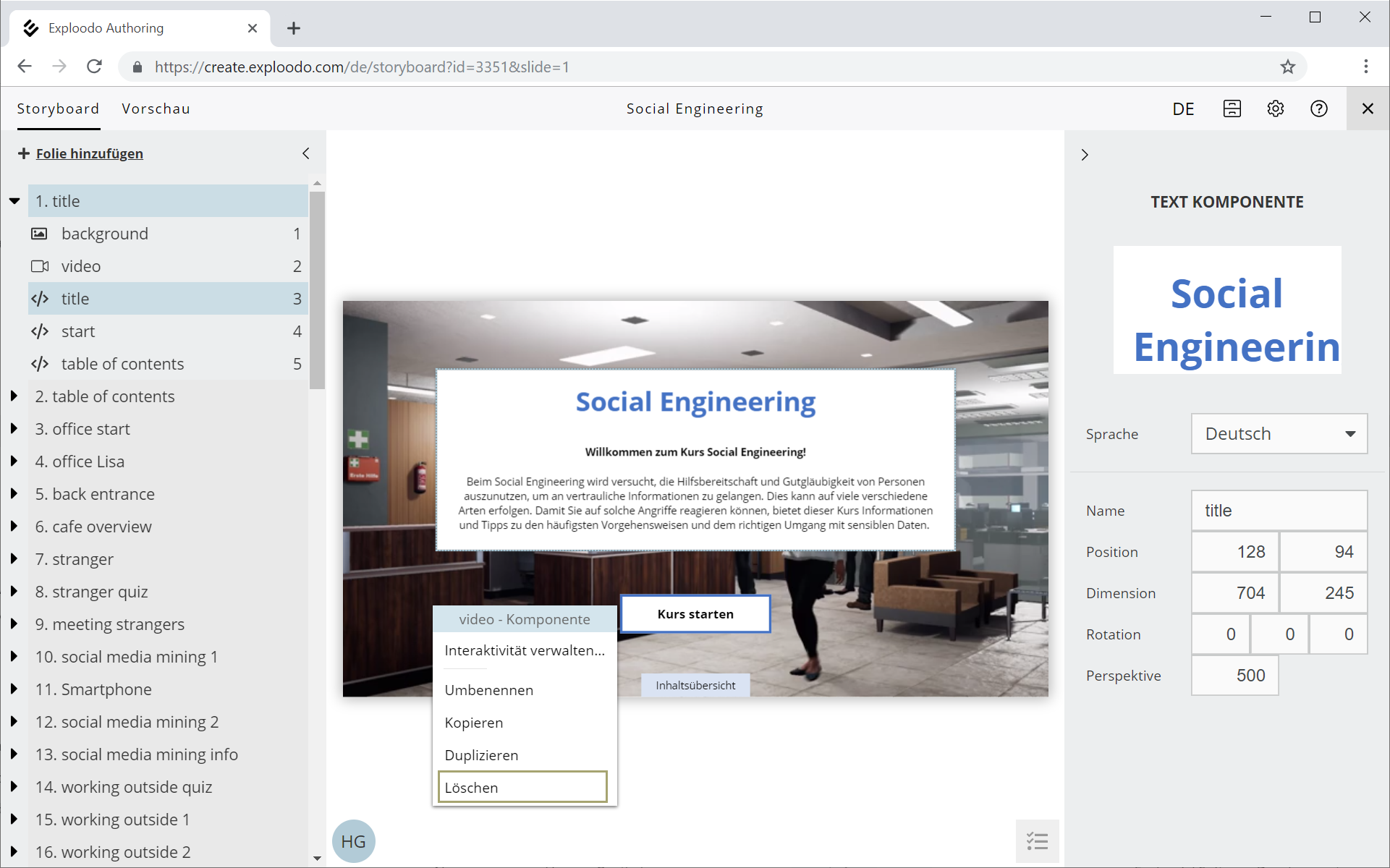 Wählen Sie eine Folien im linken Seitenmenü aus. Klicken Sie mit der rechten Maustaste auf einen leeren Bereich der Folie und wählen Sie im Menü "Video Komponente hinzufügen" aus. Es wird eine leerer Video Inhalt in der Folie erstellt. Doppelklicken Sie nun auf den leeren Video Inhalt um ein Video auszuwählen. Sie können entweder ein bereits verwendetes Video (bereits hochgeladen) auswählen, oder ein neues Video von Ihrem Computer uploaden.