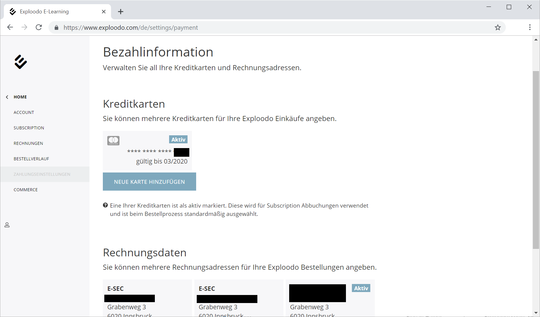 Sie können hinterlegte Kreditkartendaten oder Rechnungsanschriften jederzeit selbständig über das Formular ändern oder hinzufügen. Bitte beachten Sie, dass bei Firmen unter Angabe der UID der jeweilige Steuersatz (VAT) automatisiert berechnet und eingehoben wird.