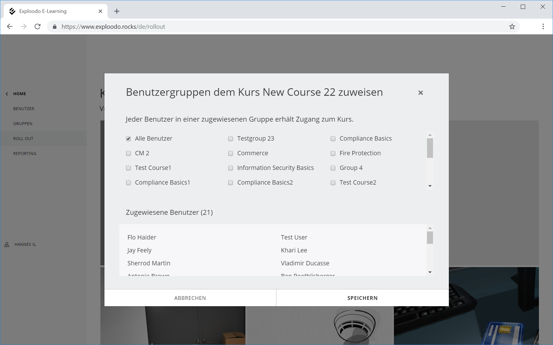- Wählen Sie nun die Benutzergruppen aus, deren zugewiesene Benutzer den Kurs absolvieren sollen und bestätigen Sie die Auswahl mit Speichern.