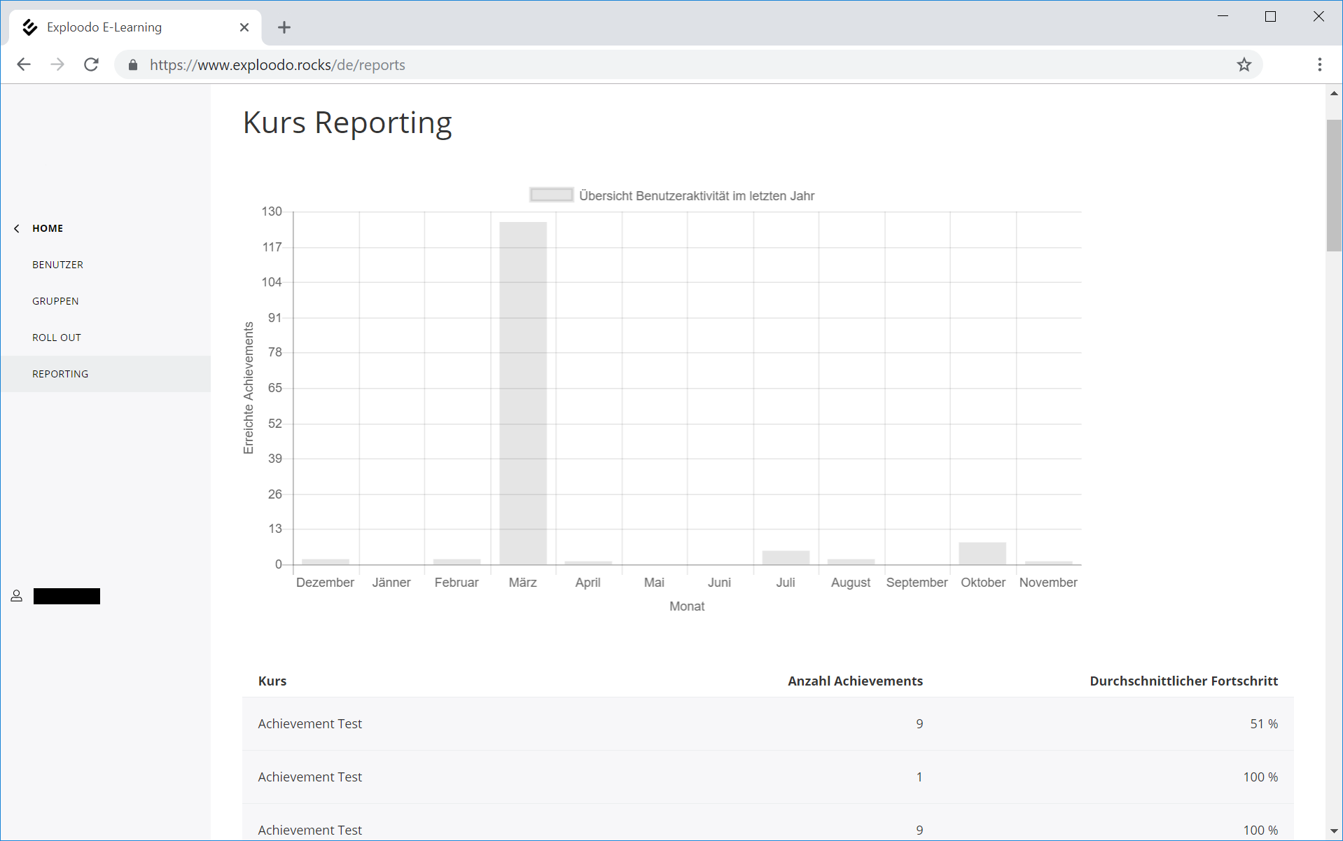 In der Übersichtsseite der Reporting Funktion sehen Sie die Benutzeraktivität des letzten Jahres und wie viele Achievements von allen Benutzer in allen Kursen erreicht wurden. Pro Kurs wird der durchschnittliche Achievement Fortschritt der Benutzer und die Anzahl der Kurs Achievements angezeigt.