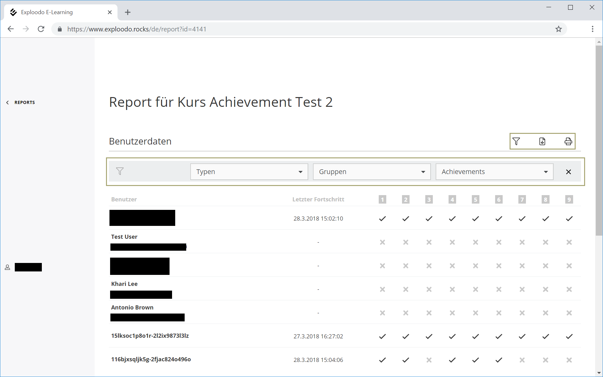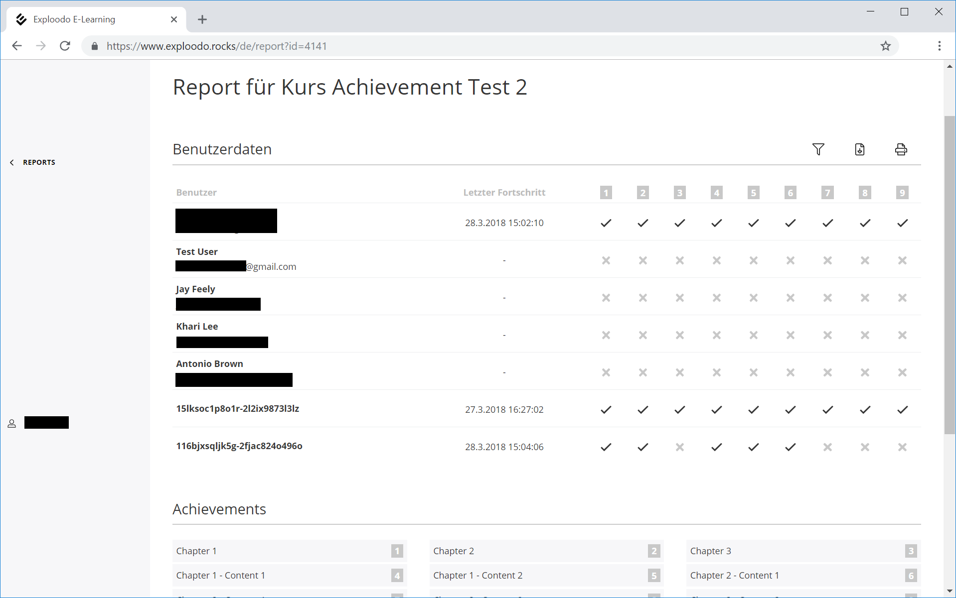 Durch Auswählen eines Kurses in der Kursliste gelangen Sie zur Detail-Auswertungsansicht eines Kurses. Hier werden die Benutzer mit den dazugehörigen Kurs Achievements und ihrem jeweiligen Status (Achievement erreicht, Achievement nicht erreicht) angezeigt. Zudem wir auch angezeigt, zu welchen Zeitpunkt der Benutzer das letzte Achievement erreicht hat (letzter Fortschritt).