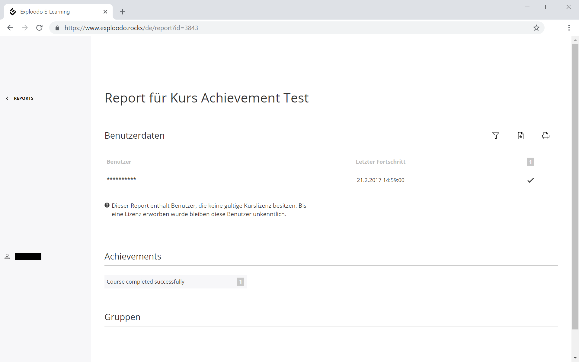 Benutzer werden im Report unkenntlich dargestellt (****), wenn diese keine gültige Kurslizenz besitzen. (d.h. es wurden weniger Kurslizenzen für den Kurs gekauft als Benutzer zugeordnet). Sie können jederzeit Lizenzen nachkaufen um den Report aller Benutzer einzusehen.