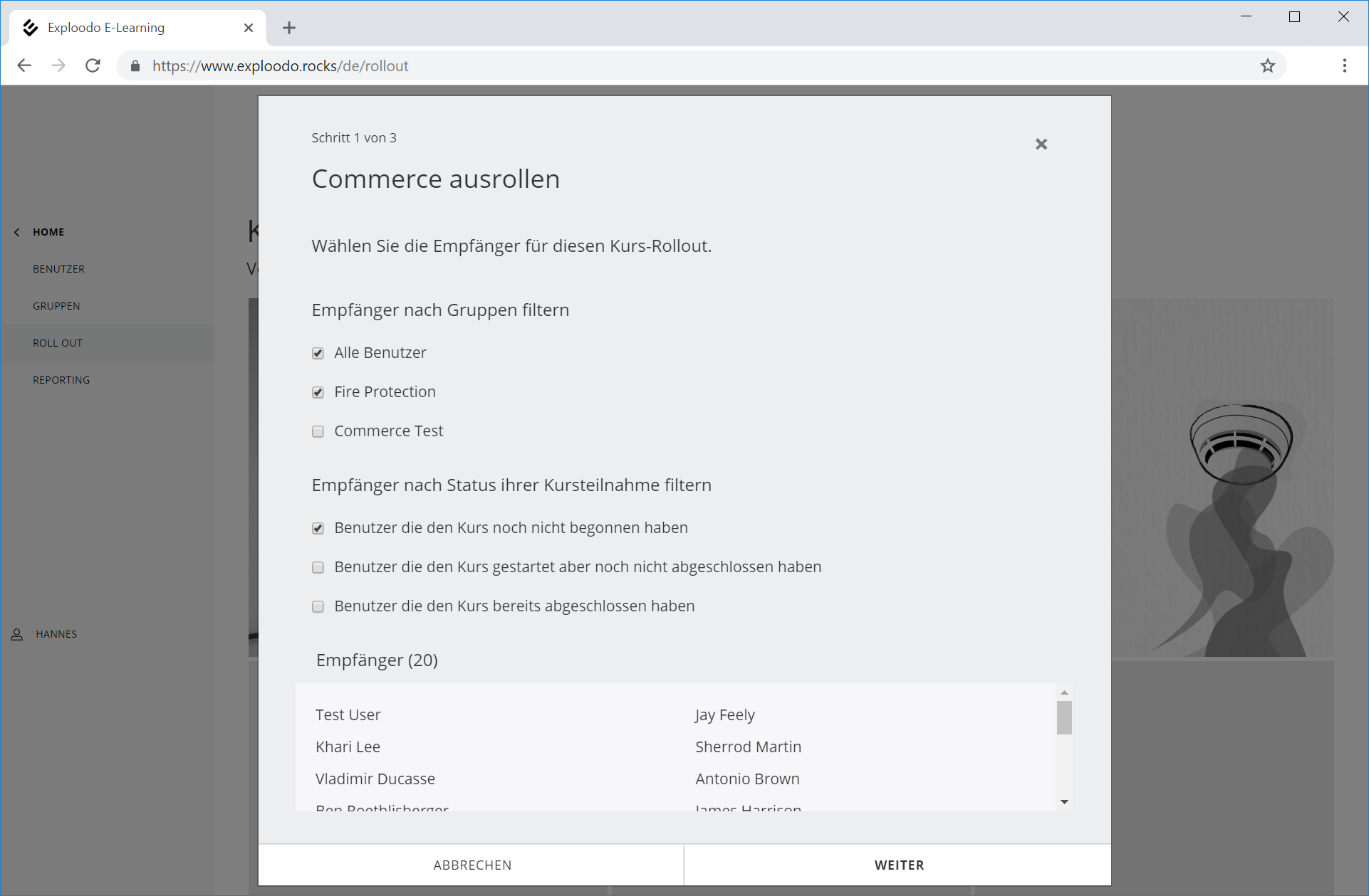 Beim personalisierten Roll-Out wählen Sie die Benutzer aus, welche den Kurs absolvieren sollen. Zur Auswahl stehen alle zuvor dem Kurs zugeordneten Benutzer bzw. Gruppen. Benutzer können zusätzlich nach dem Status ihrer Kursteilnahme gefiltert werden. Zur Kontrolle wird unter "Empfänger" eine Liste aller Benutzer, die mit der gewählten Konfiguration zum Kurs eingeladen werden, angezeigt.