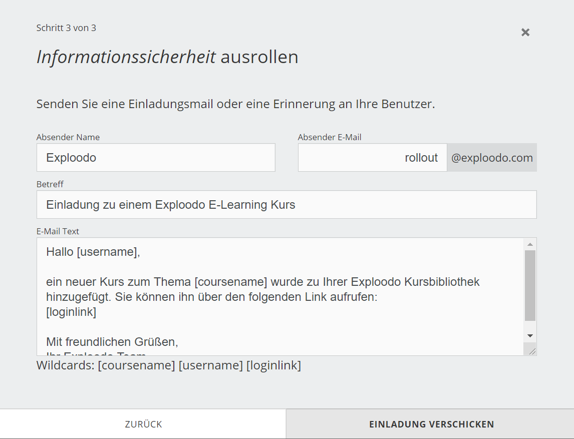 Hinweis: Damit der Mailversand einwandfrei funktioniert, müssen alle drei Wildcards ([coursename] [username] [loginlink]) im Text enthalten sein.