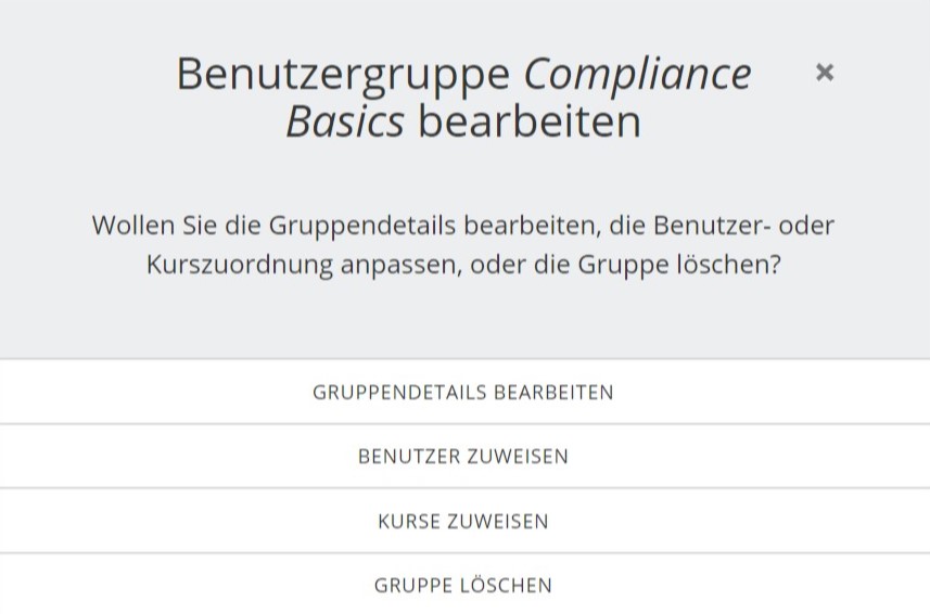 - Unter dem Menüpunkt "Gruppen" können Sie Benutzergruppen erstellen und bearbeiten (Kurse aus Ihrer Bibliothek hinzufügen, Benutzer zuweisen etc. - siehe Screenshot).