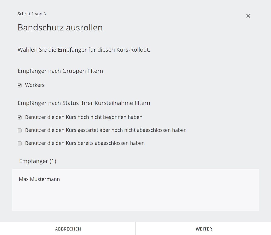 - Bei "Kurs ausrollen" wählen Sie "Personalisierter Roll-Out" sowie die Empfänger aus und klicken auf "Weiter".