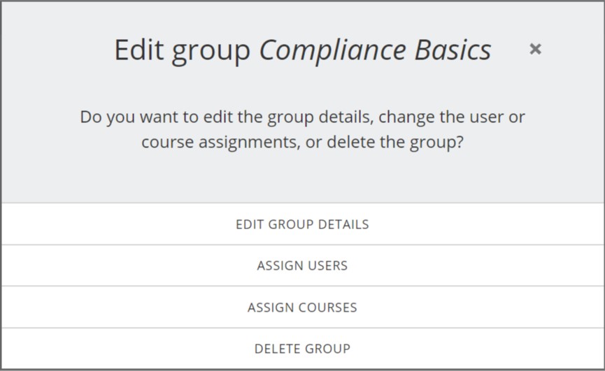 - Under the menu item "Groups", you can create and edit user groups (add courses from your library, assign users etc. - see screenshot).