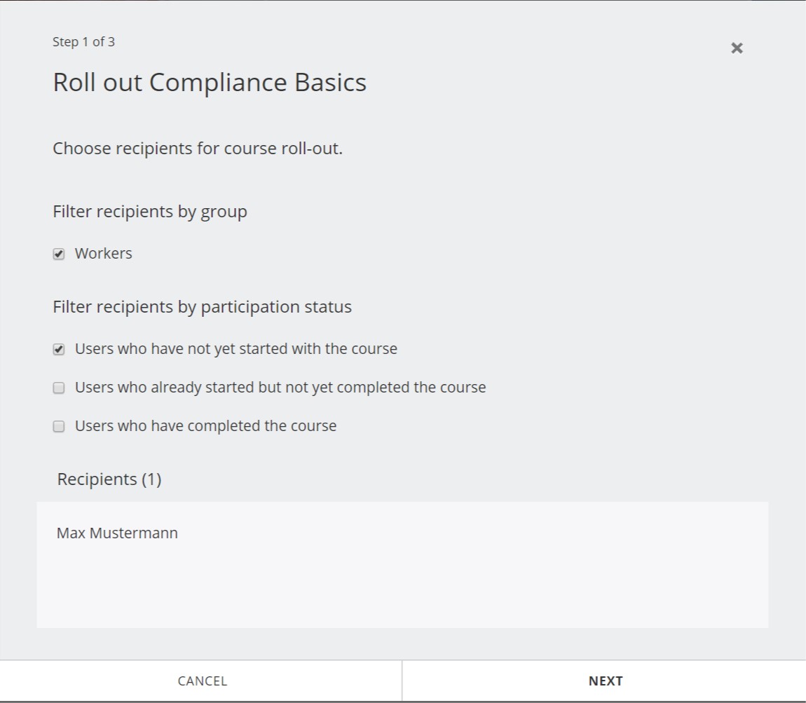- After clicking on "Roll Out Course", select "Named User Roll-Out", click on the recipients of your choice and then on "Next".