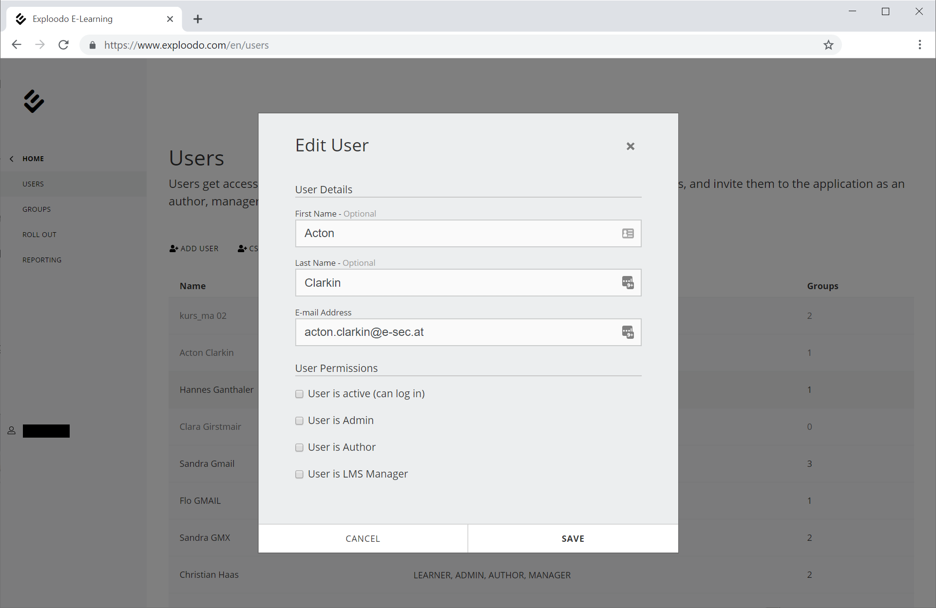 You can check all the information about a certain user which has been saved in Exploodo in the user detail view. There you can see the user status (active, inactive), his role and all the user groups he has been assigned to.